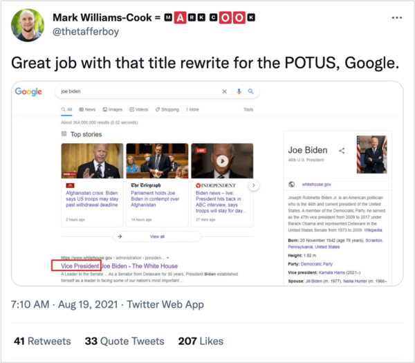 In perhaps one of the most horribly botched examples—POTUS has suddenly been demoted to vice president, according to Google. The article itself provides a brief history of President’s Biden’s run as the 47th vice president. Google likely picked up on the various mentions of “vice president” within the article (both in the body text and headers) and used them to craft this outdated title.