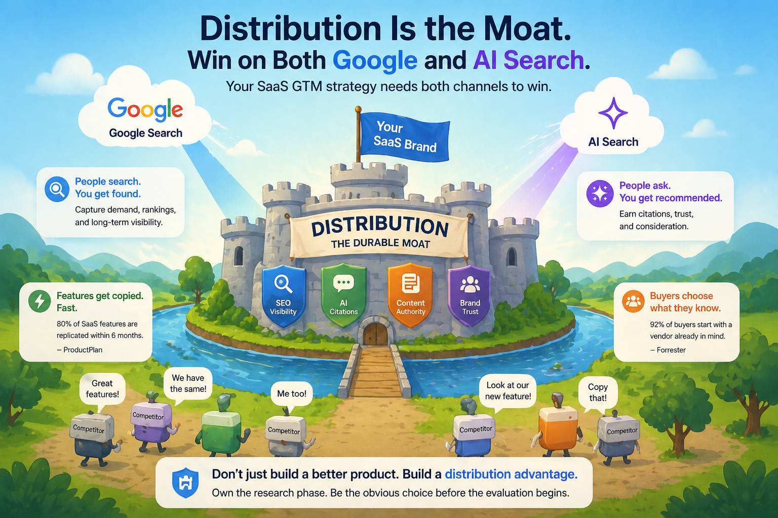 In saturated SaaS categories, the brands that win consistently are not the ones with the best feature set. They are the ones with the best distribution. Showing up in search and AI answers during the research phase is the durable competitive advantage that product alone cannot replicate.